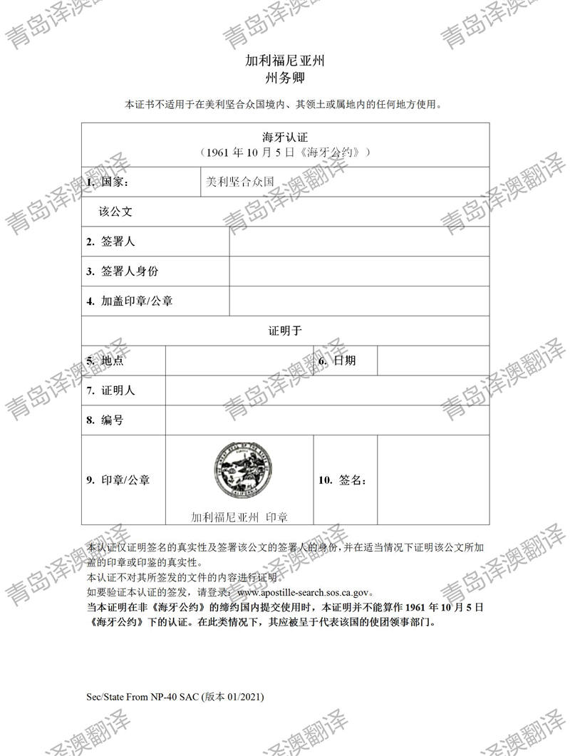 【青岛翻译公司】青岛译澳翻译——美国加利福尼亚州海牙公证